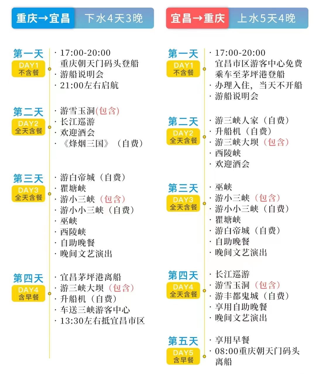 5.长江黄金系列游船套票包含:在船期间住宿+离船岸上景点游览+指定餐厅免费膳食+游船服务费+船上指定设施+船方组织的娱乐节目和讲座等,具体信息以下列内容为准。