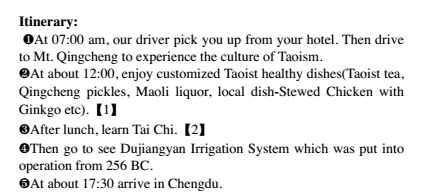 1. Sightseeing bus in Dujiangyan(10rmb/person for one way,15rmb/person for roundway);